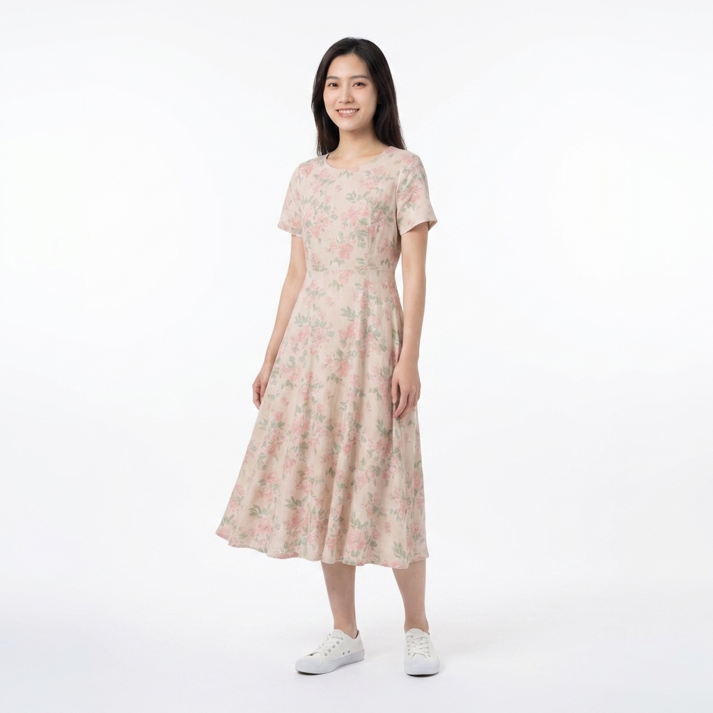 Light floral summer dress with natural cotton draping — the AI preserves fabric weight and gentle movement in the swap.