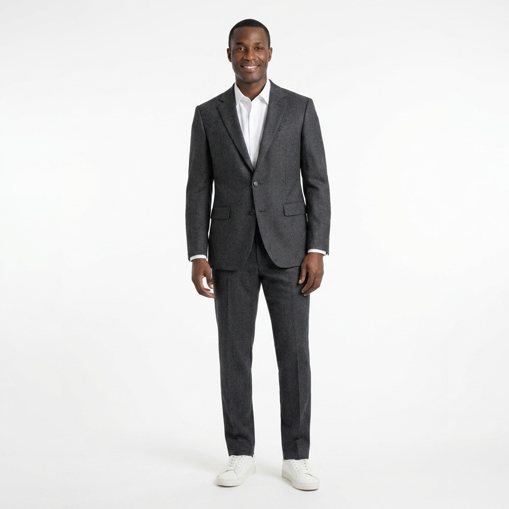 Tailored charcoal suit with structured shoulders and proper lapel fold — AI maintains the garment architecture.