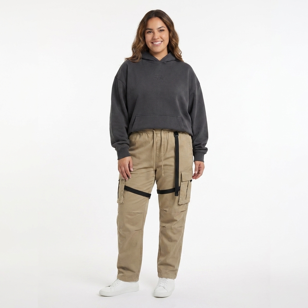 Oversized hoodie and cargo pants — the AI captures the relaxed fit and heavy cotton fleece texture.